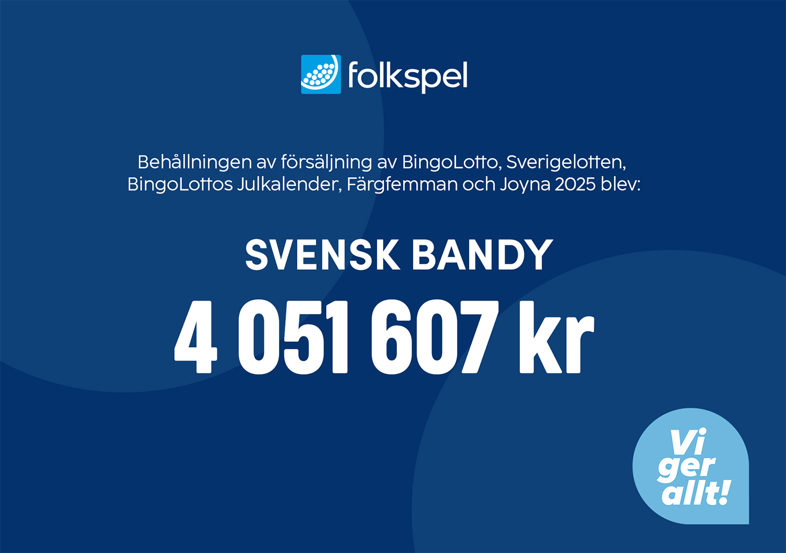 4 051 607 kr. Så mycket har Folkspel betalat ut till landets bandyföreningar senaste året. Totalt har föreningslivet tjänat hela 372 miljoner kronor på att sälja Folkspels lotter under året - det största överskottet på 20 år. – Alla ska ha råd till rörelse. Det här hjälper förhoppningsvis till, säger Hans Sahlin, vd på ideella Folkspel.